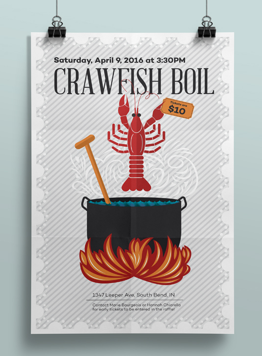 Illustrated poster to advertise the annual Notre Dame Design Department crawfish boil fundraiser and student networking event